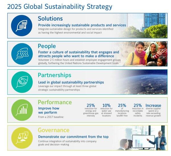 2017年、私たちは「2025年サスティビリティ戦略」を採用しました。この戦略は、「ソリューション」「人財」「パートナーシップ」「パフォーマンス」「ガバナンス」の5つの分野に焦点を当て、当社のバリューチェーン全体でサスティナビリティを推進するものです。