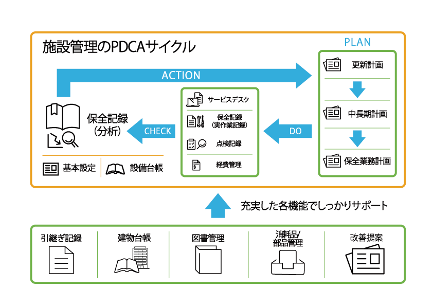 コスト削減、業務改善、品質向上、スペースの有効利用、さらには環境 管理、安全衛生、コンプライアンスなど取り組むべき課題が山積みです。これらの課題を解決するためには、日々の運用管理の情報を正確に収集、分析し、継続的な改善ができる仕組みを整えることから始める必要があります。