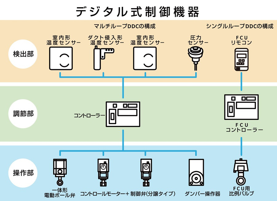 自動制御機器は、施設内の温度・湿度を自動的に調節したり、ボイラーや冷凍機を安全に運転するための自動調節を行う機器です。一般住宅から超高層ビルにいたるまであらゆるところ建物に導入されており、設備やシステムを自動制御することで快適な環境を創り出し、空調における省エネルギー化にも貢献しています。当社では施設や用途に応じ豊富で幅広い自動制御機器をご用意しています。