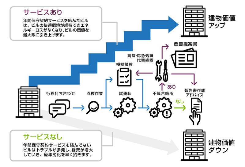 年間保守契約に基づいたメンテナンスを行うことによって、ビルを利用する皆様の快適環境を守るとともに、ライフサイクルコストを低減させます。そして、ビルの設備能力を最大限に引き上げることで、ビルの価値を高めます。