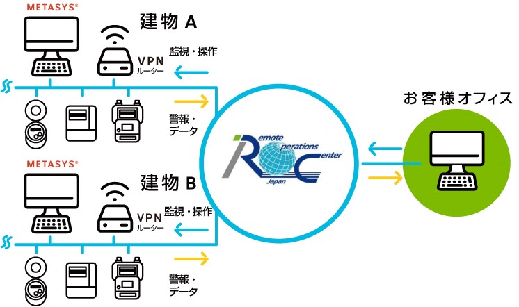 複数のビルをお持ちのお客様に対し、当社のROC(リモート・オペレーション・センター)を介して警報監視、空調制御、エネルギーの使用状況を24時間遠隔監視できます。
